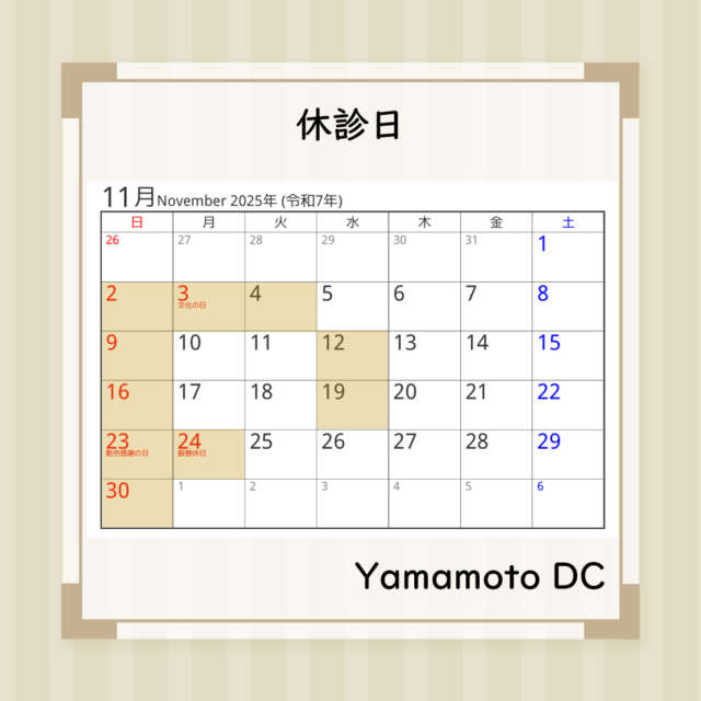 11月の休診日は、日曜祝日と11/4、11/12、11/19です。